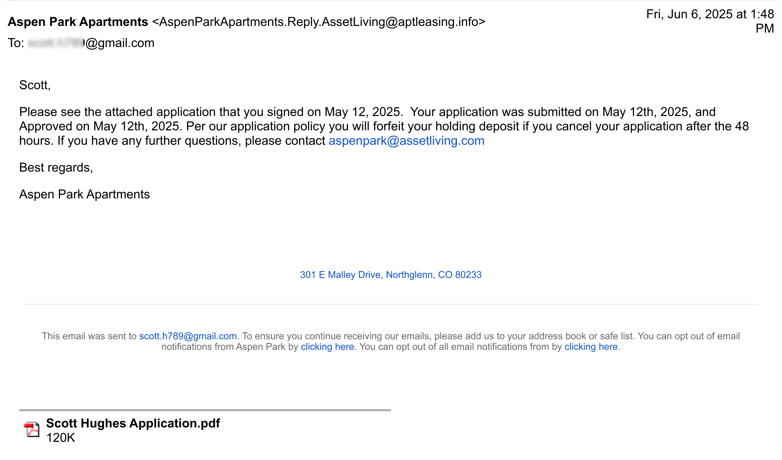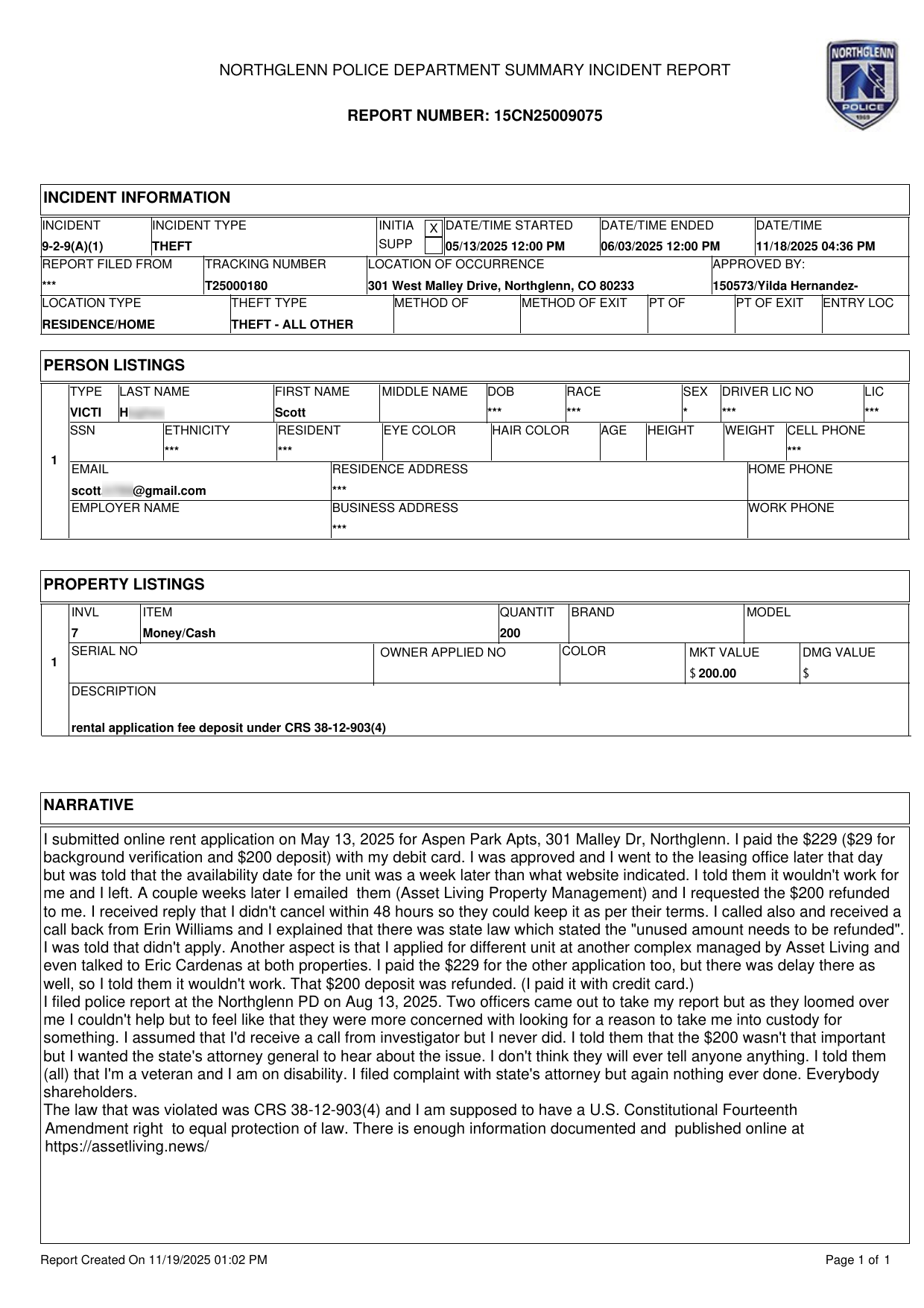 I submitted online rent application on May 13, 2025 for Aspen Park Apts, 301 Malley Dr, Northglenn. I paid the $229 ($29 for background verification and $200 deposit) with my debit card. I was approved and I went to the leasing office later that day but was told that the availability date for the unit was a week later than what website indicated. I told them it wouldn't work for me and I left. A couple weeks later I emailed them (Asset Living Property Management) and I requested the $200 refunded to me. I received reply that I didn't cancel within 48 hours so they could keep it as per their terms. I called also and received a call back from Erin Williams and I explained that there was state law which stated the "unused amount needs to be refunded". I was told that didn't apply. Another aspect is that I applied for different unit at another complex managed by Asset Living and even talked to Eric Cardenas at both properties. I paid the $229 for the other application too, but there was delay there as well, so I told them it wouldn't work. That $200 deposit was refunded. (I paid it with credit card.) I filed police report at the Northglenn PD on Aug 13, 2025. Two officers came out to take my report but as they loomed over me I couldn't help but to feel like that they were more concerned with looking for a reason to take me into custody for something. I assumed that I'd receive a call from investigator but I never did. I told them that the $200 wasn't that important but I wanted the state's attorney general to hear about the issue. I don't think they will ever tell anyone anything. I told them (all) that I'm a veteran and I am on disability. I filed complaint with state's attorney but again nothing ever done. Everybody shareholders. The law that was violated was CRS 38-12-903(4) and I am supposed to have a U.S. Constitutional Fourteenth Amendment right to equal protection of law. There is enough information documented and published online at https://assetliving.news/